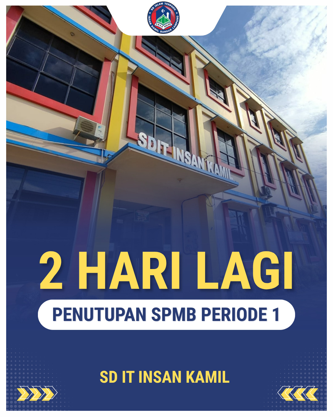 Kami sampaikan kepada ayah dan bunda bahwa Sistem Penerimaan Murid Baru SD IT Insan Kamil Bandar Lampung, Jl. Karimun Jawa No. 121 Sukarame Bandar lampung Periode 1 tinggal 2 hari lagi.